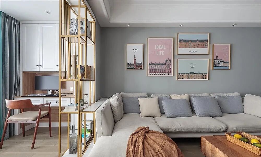 清新舒适的100平北欧风格新房装修案例,沙发墙上挂满漂亮的挂画。阳台利用小隔断,打造成独立小书房空间,特别喜欢!