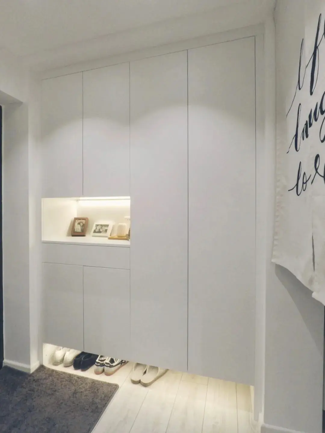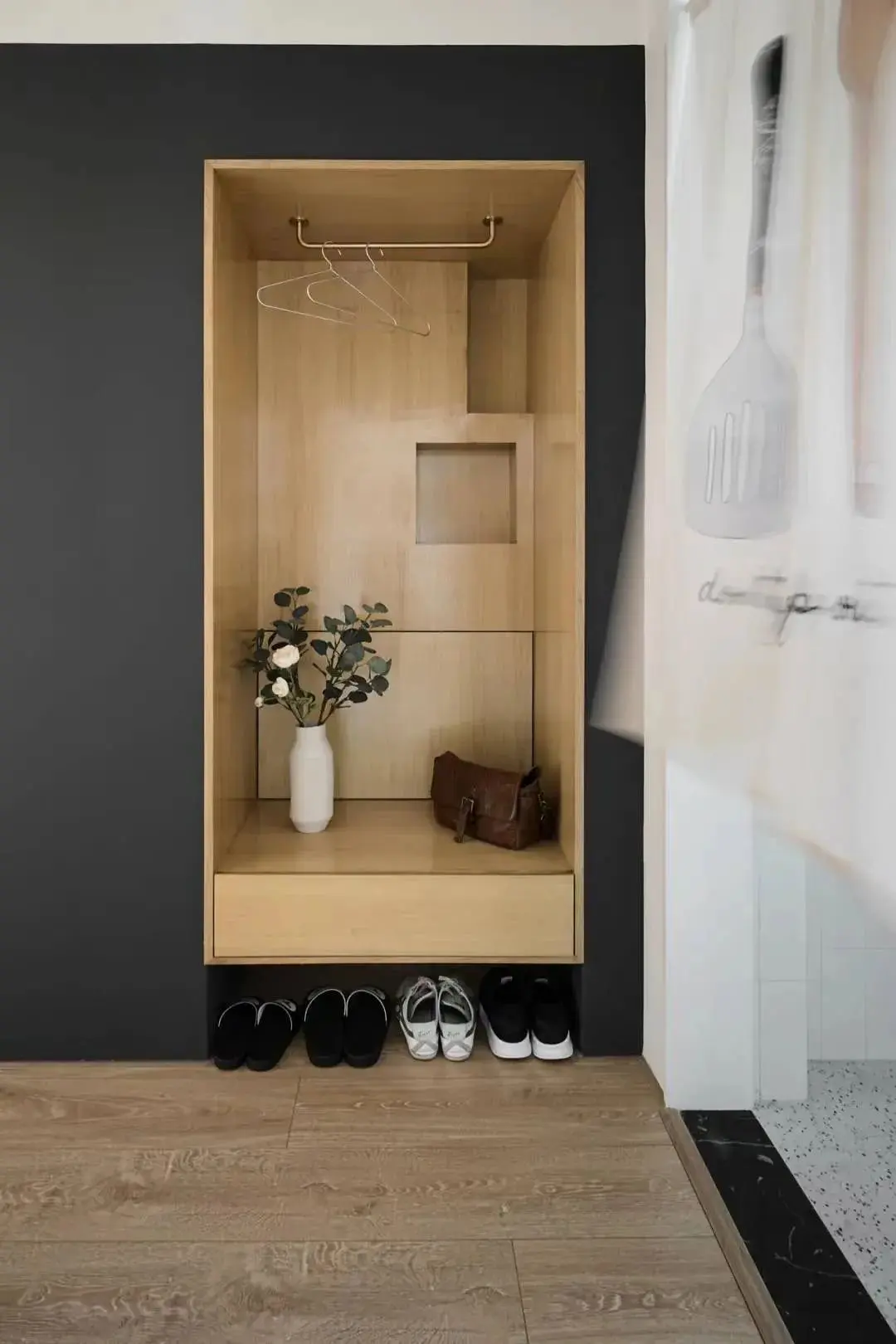 玄关平整的柜门,左侧底部留空特别突兀,想挂衣换鞋,壁龛式的储物柜难道不香吗?