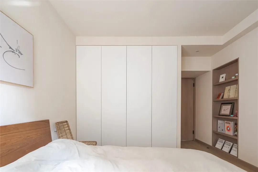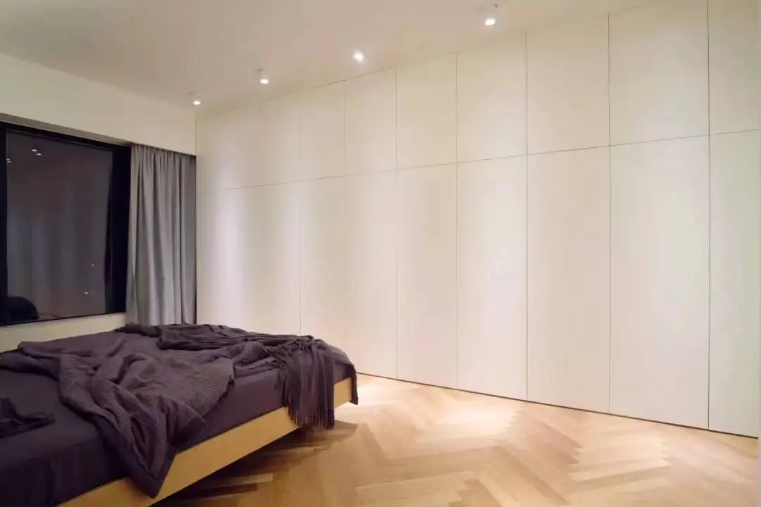 通过把柜子的高度做到通顶的位置,与墙面一体化,以及将柜子的门板、装饰、线条简化,无论柜子内部的收纳模块有多繁琐,关上柜门,整个空间一秒变得干净整洁。