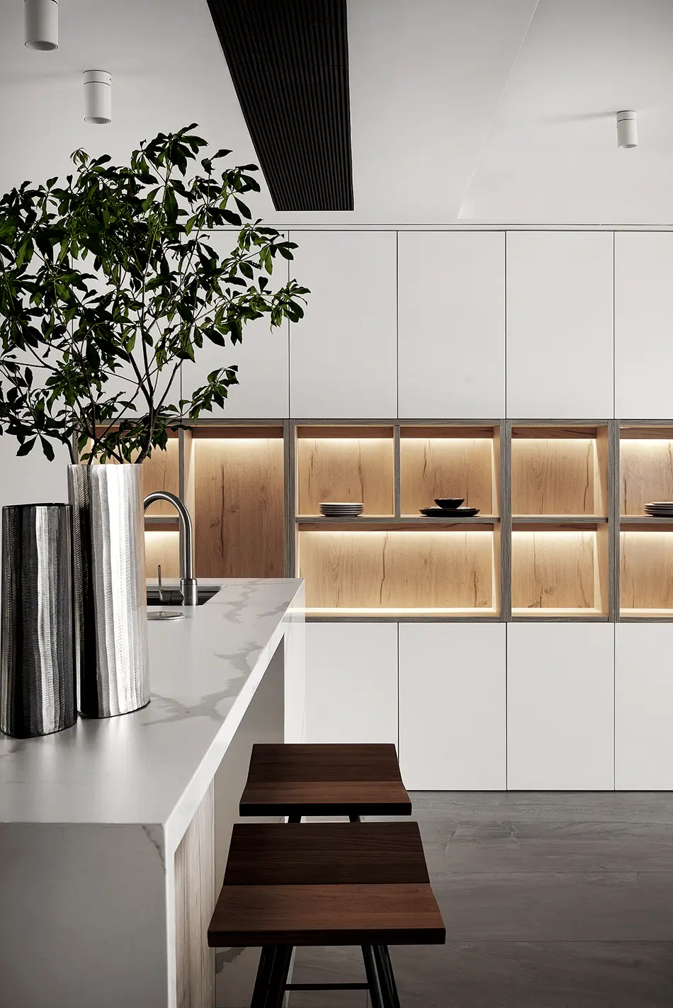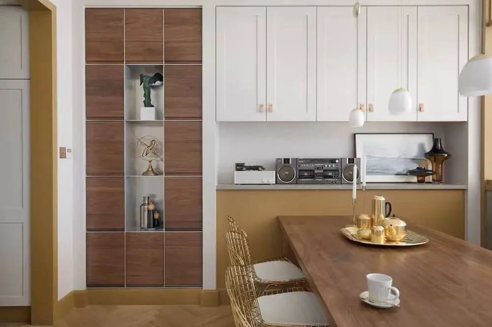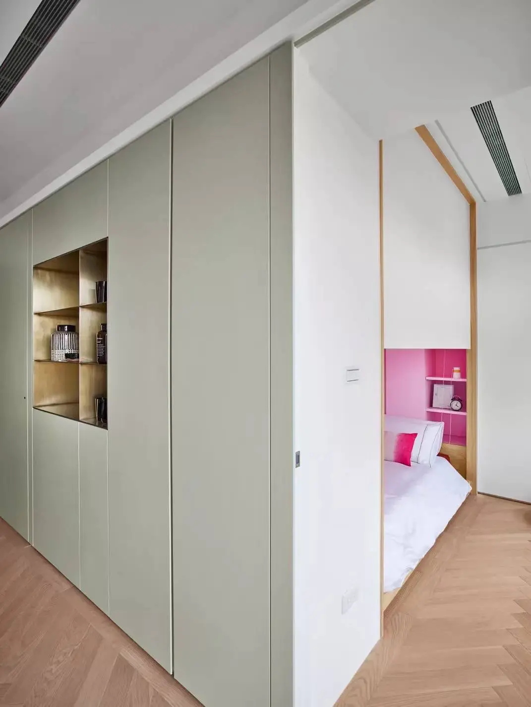 此外,还有一个大招,把柜子做成入墙式,肯定能提升它的颜值。当柜子隐藏了厚度,就会有纸片式的单薄感,在视觉上毫无拥堵感。