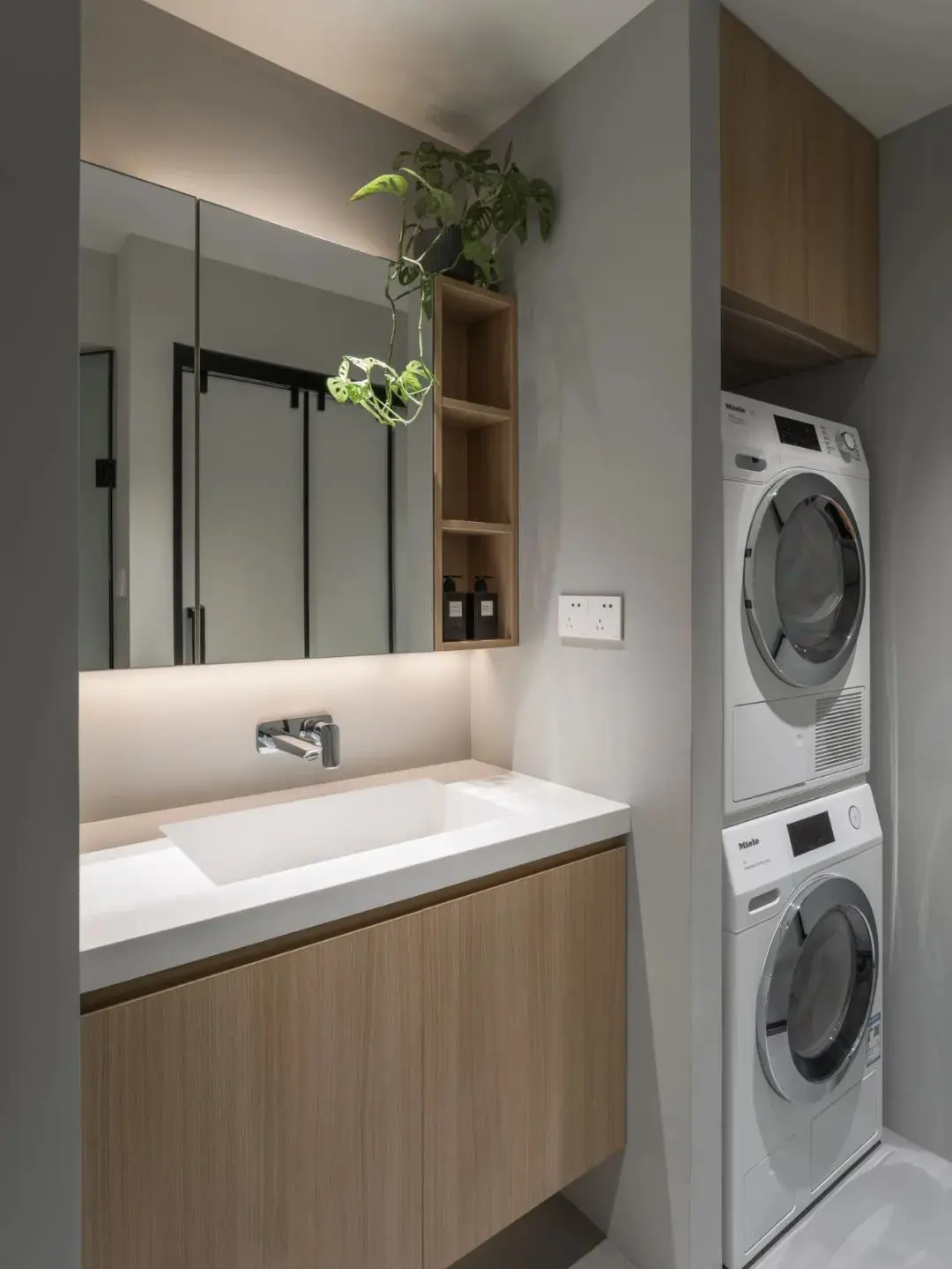 墙体的正面做通顶的嵌入式玄关柜,背面拓展盥洗区和洗衣区的柜体。