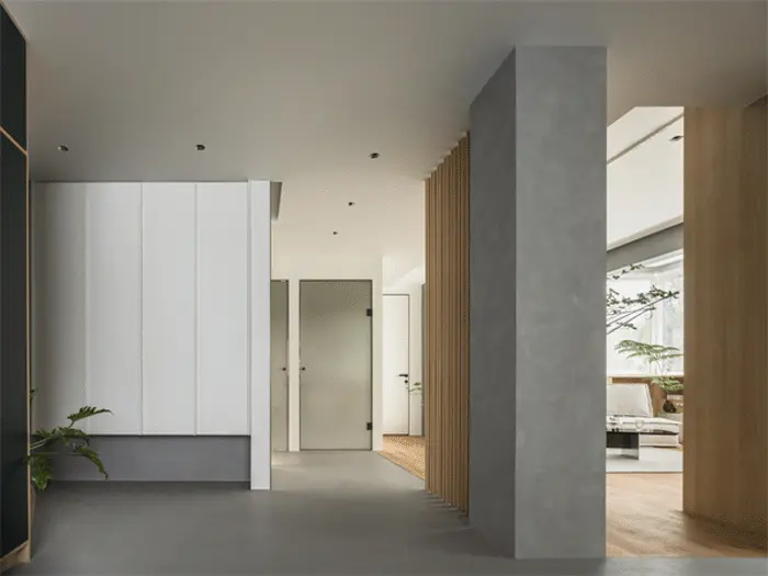 而且这种做法造价也不高,前几天,宅sir分享的这个两娃之家,设计师傅俣迪就对玄关的墙体进行结构调整,利用石膏板在入户造了一个多凹墙结构的“假墙”。