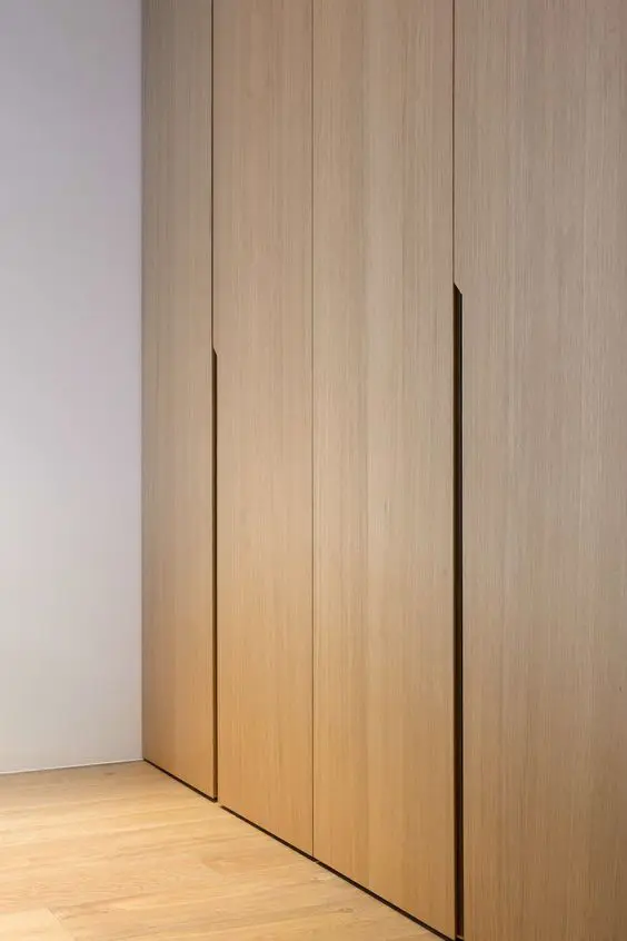 在门板之间留出2cm左右缝隙,方便手指伸进去,这样不用把手也能开门。