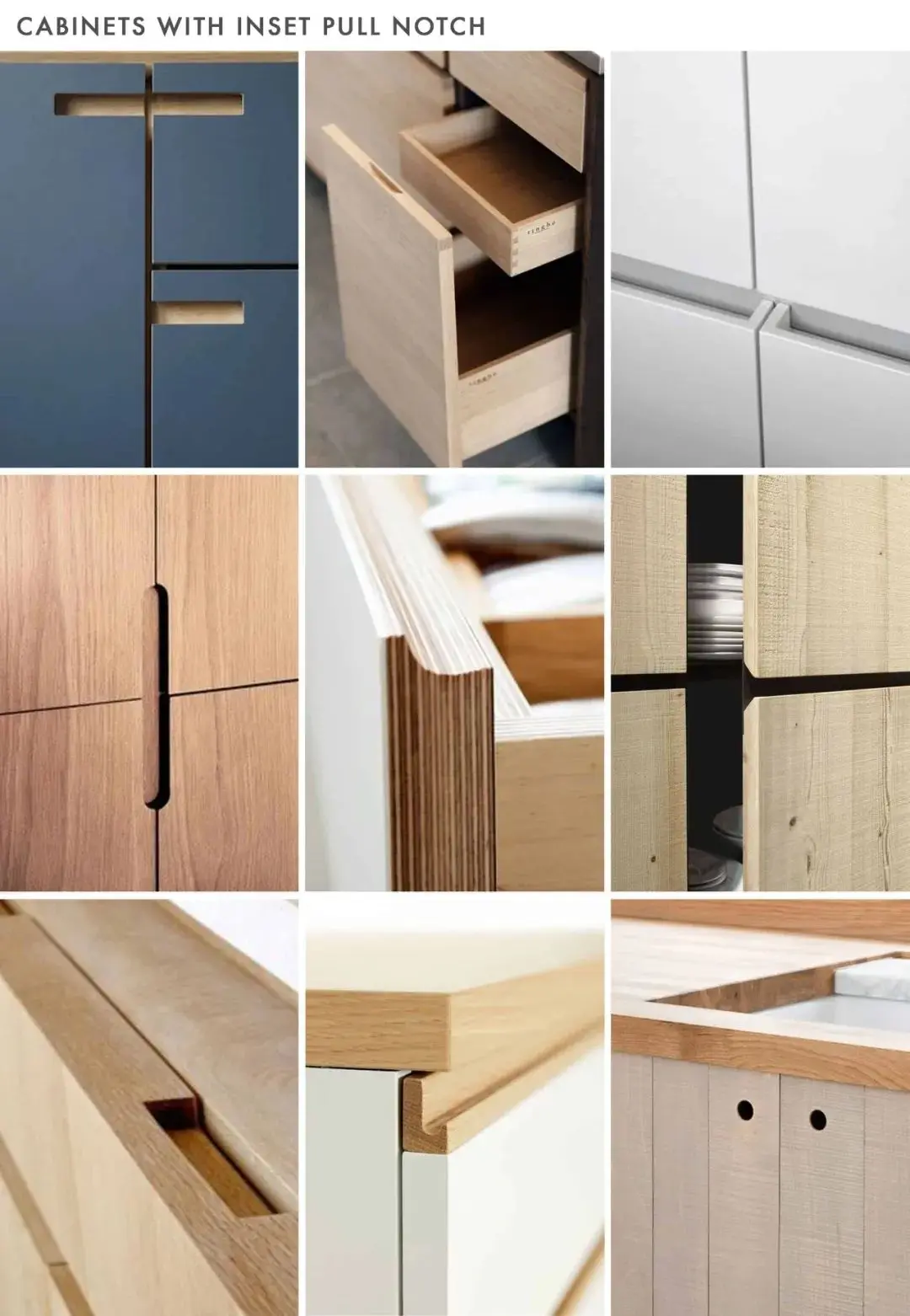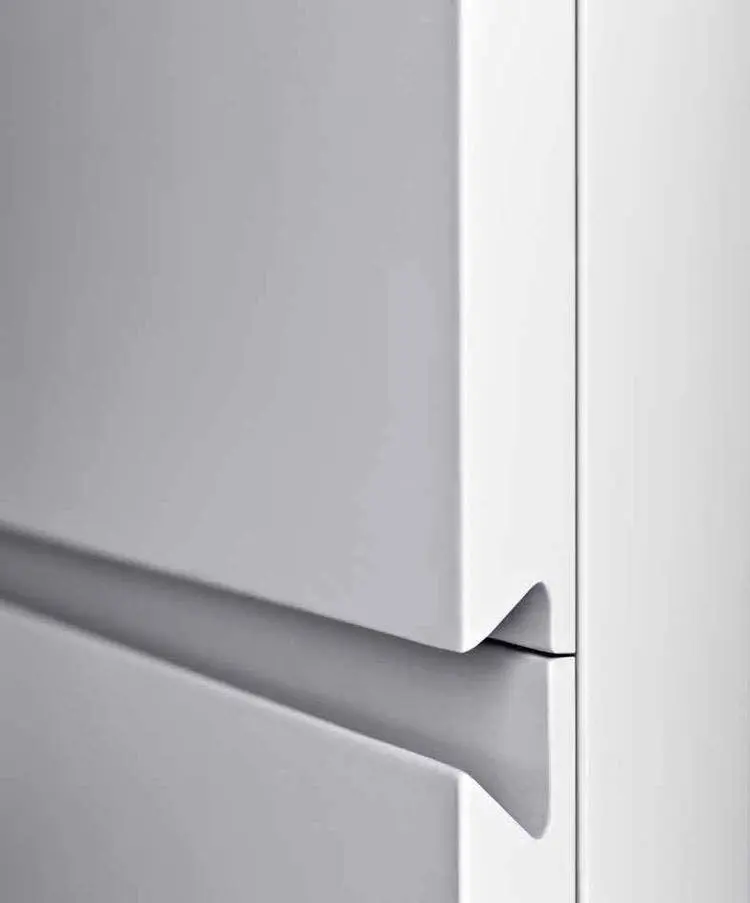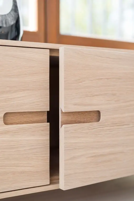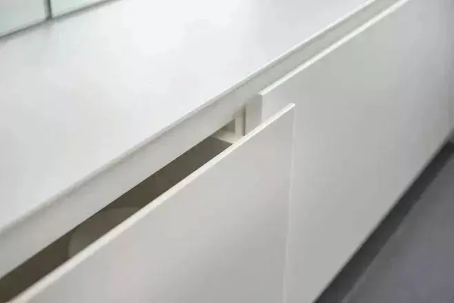 通过特殊切割工艺在柜子或门板抠出造型各异的凹槽作为施力点,人的手指在接触门板后会自觉挪到凹槽处,然后借力就可打开柜门。