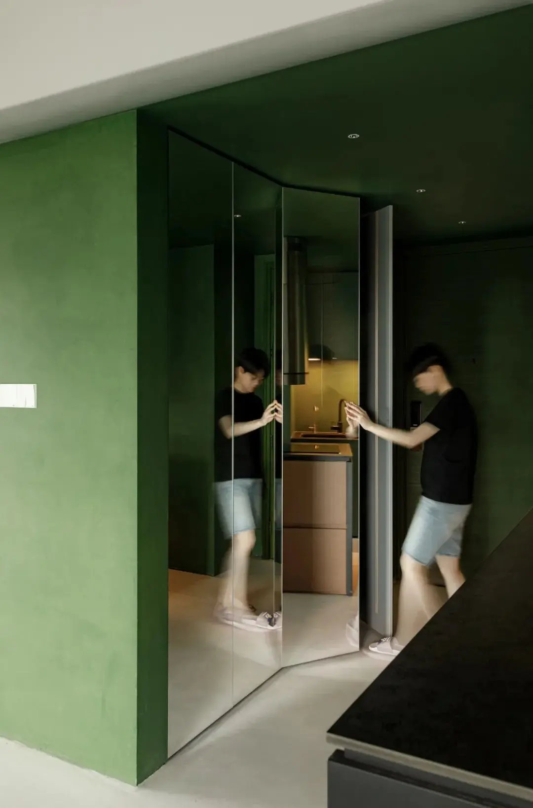最后一种方法是最常见,也是最好用的隐形方式,装了反弹器或碰珠的柜子,从外面看起来就像是一面没有任何装饰、把手的门板。