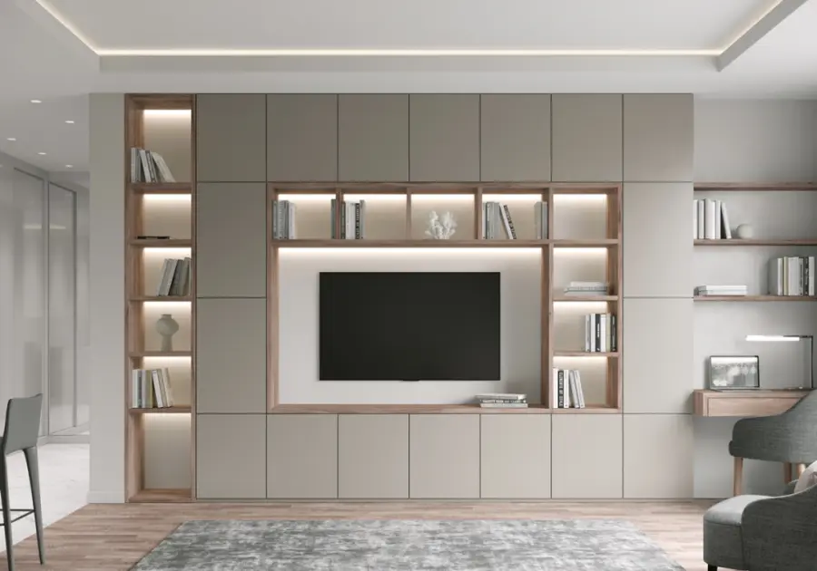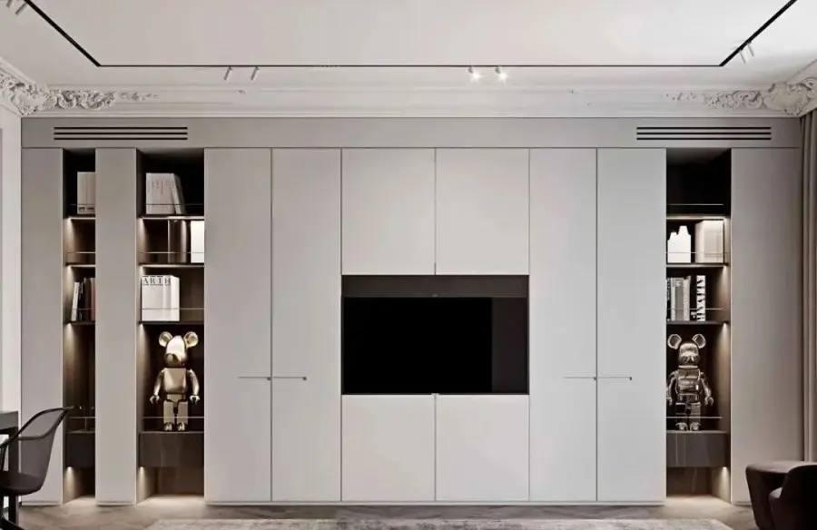 电视墙这个位置,区域较大且集中,如果做成整墙收纳,容量不可小觑。