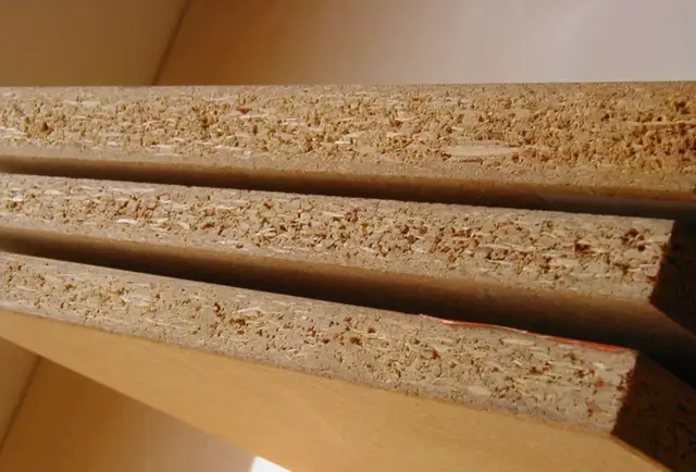 颗粒板由木头碎屑和胶水压制而成,具有较好的装饰性和加工方便性,适合做柜体、柜门。由于价格便宜,各项性能相对均衡,性价比较高,是现在市面上使用最多的一种板材。