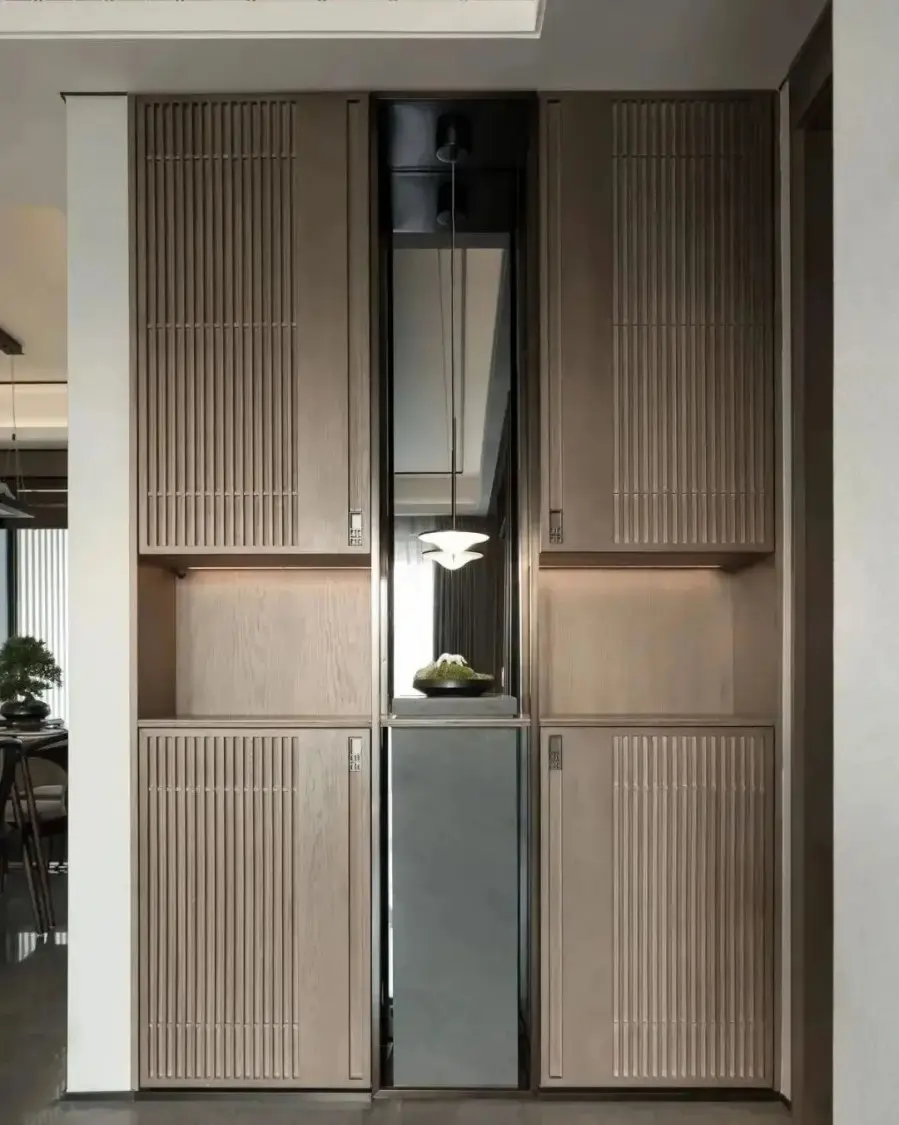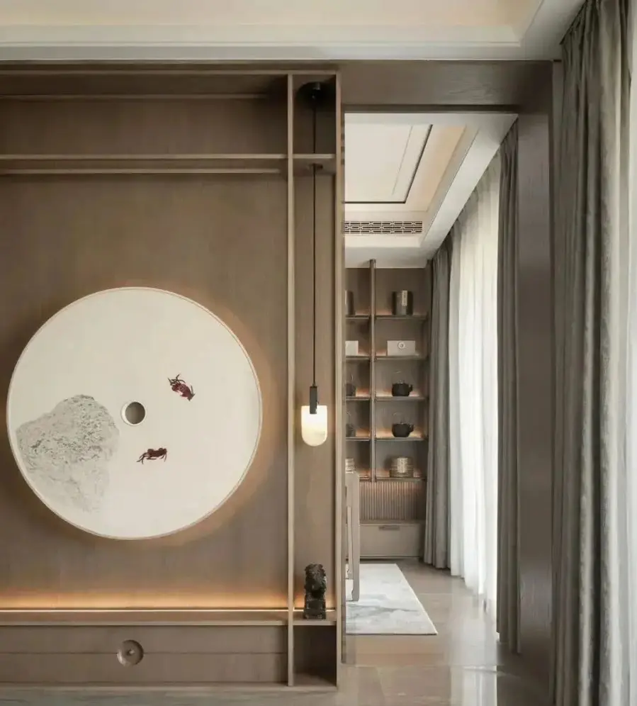 玄关入口,用木色打底,勾勒出了一种简单典雅的新中式风格,笔直的线条点缀着整个空间,中间留出一定的空间放置物品,中间还挂着一盏中国风格的吊灯,营造出一种“框景”的感觉。