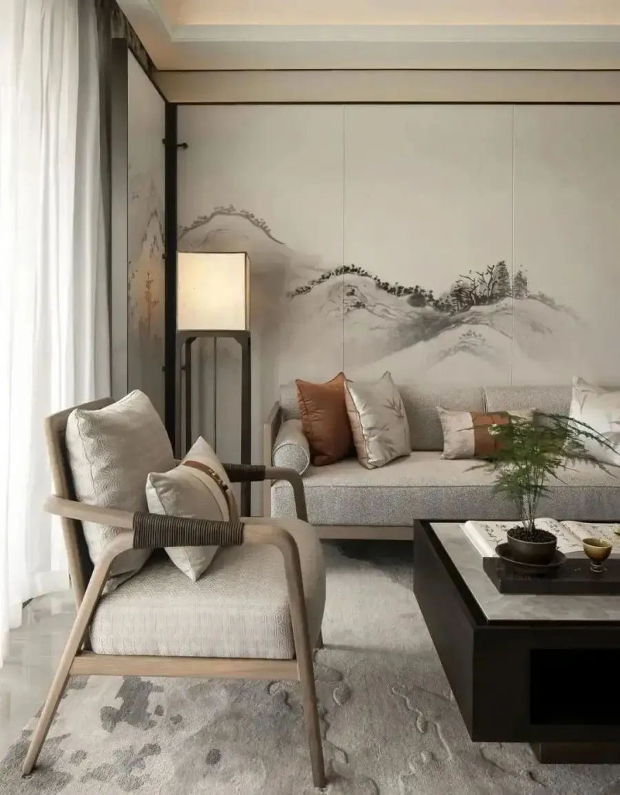 新中式风格的家具与棉麻沙发、布枕相结合,使整个构架看起来更为轻巧,布局延续传统的围合手法,中正大气,处处体现着精巧的构思。
