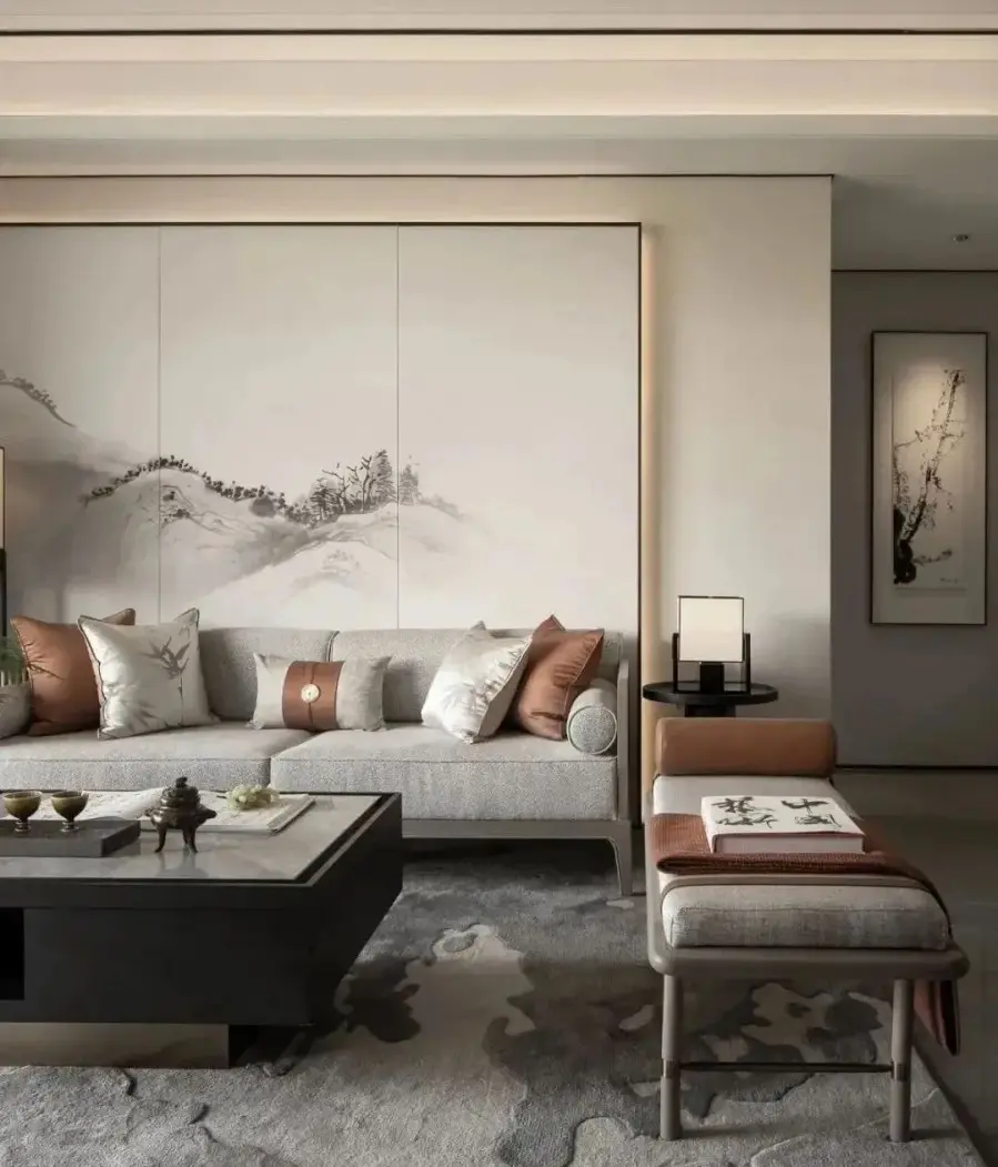 灰色的布艺沙发,褐色的丝绸抱枕,中式的图案与整个空间融为一体,墙壁和天花板上都镶嵌隐形光源,光影变幻,相得益彰。