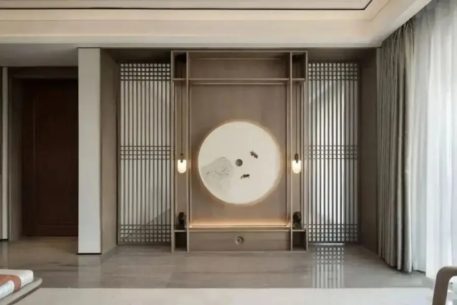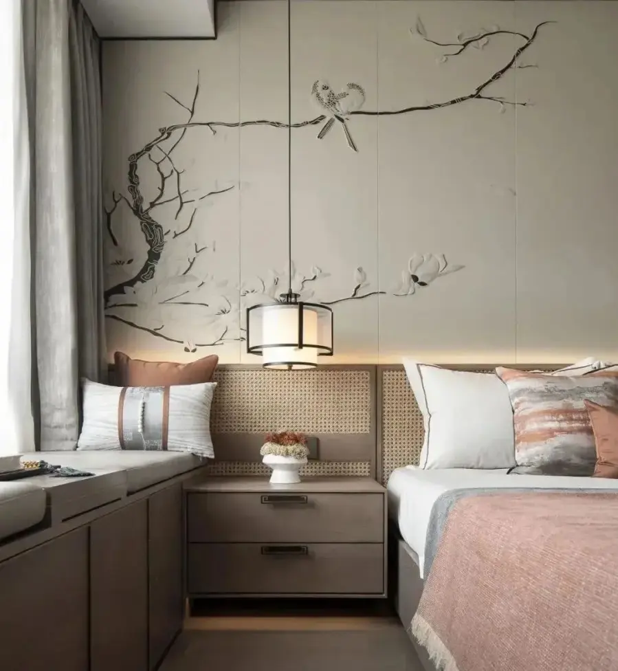 背景墙壁采用了水墨风格的硬包设计,将中国文化融入到了这个空间之中,将空间安排得井井有条,一边还配上了一盏极简的灯,以此来表现出东方的淡雅风格和品味。