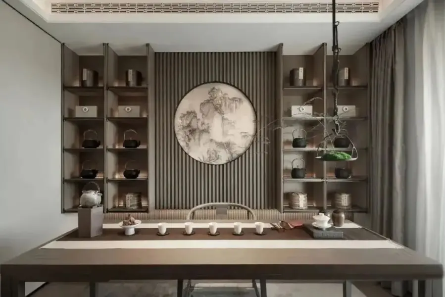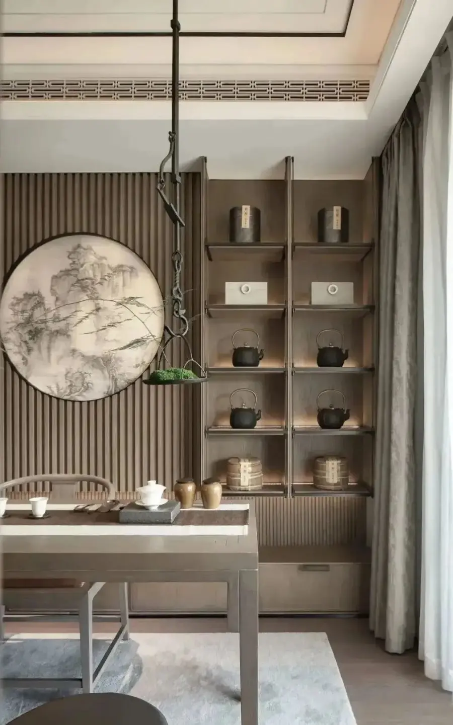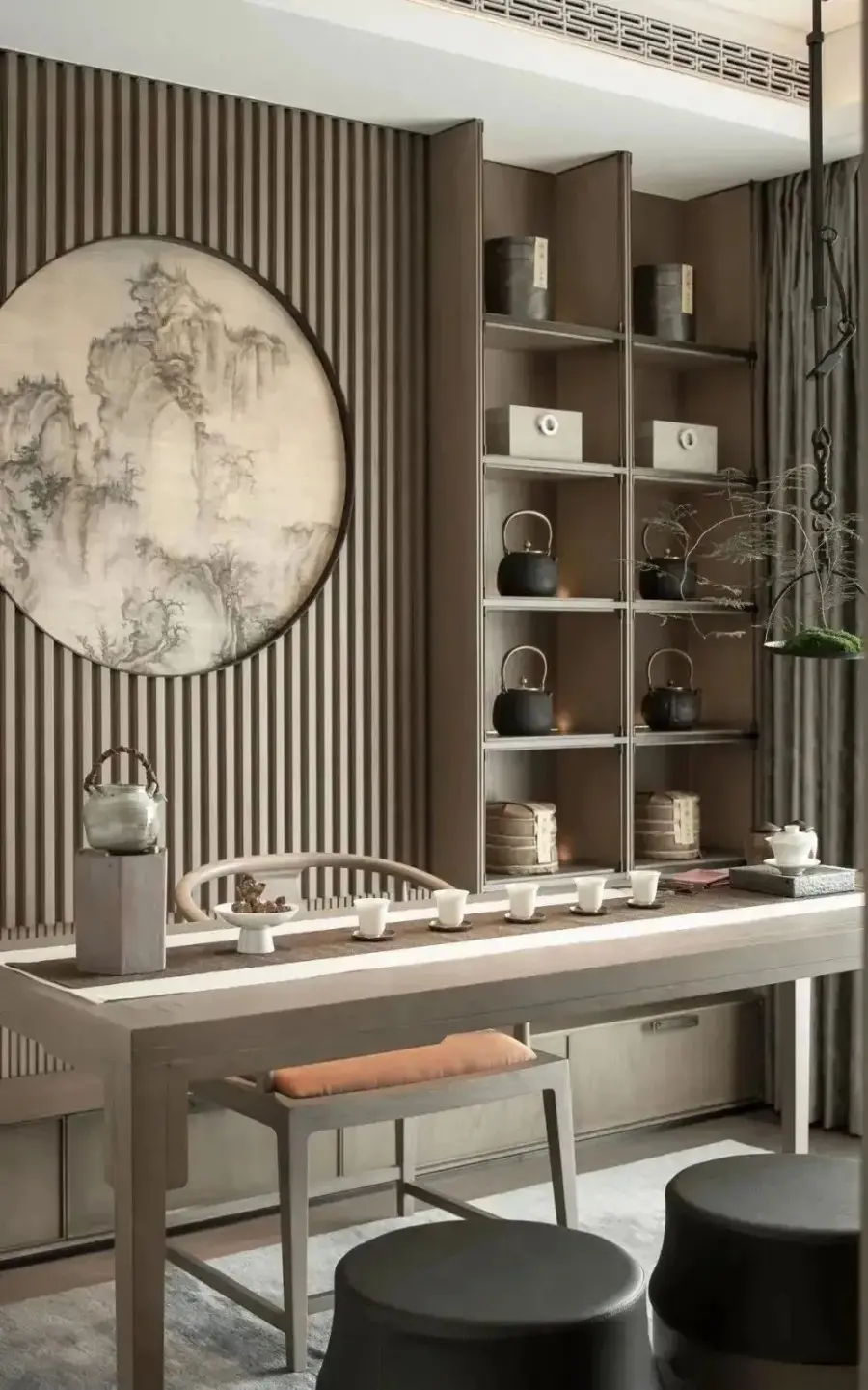 以中国元素为背景,以栅栏为造型,以圆形的水墨为点缀,两排整齐的茶具陈列柜,点缀着插花和盆景,让人在时间的长河中,听着禅音,仿佛与器物对话。