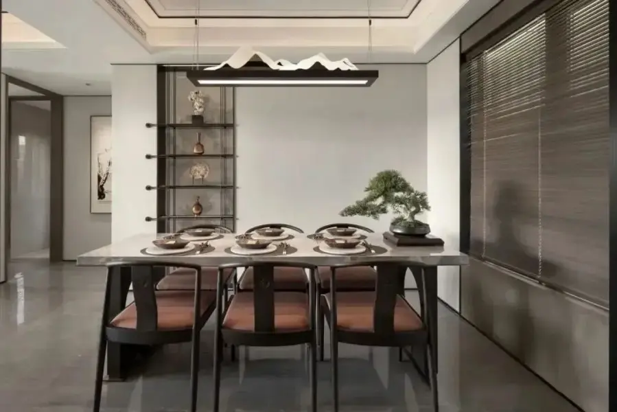 餐厅,深木色的餐椅、新中式吊灯、繁茂的松树盆景与原木色调的结合、竹子的百叶窗,透露出一种含蓄却不失典雅的新东方风格。