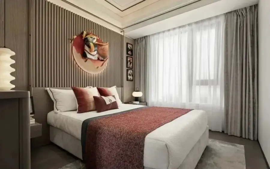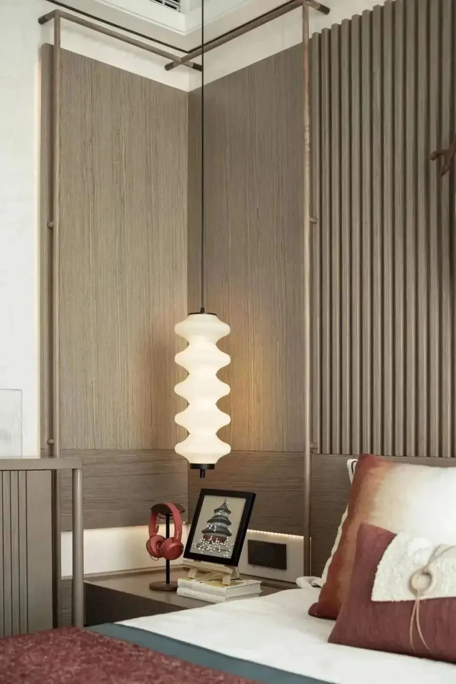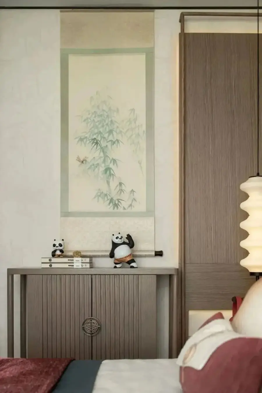 转角木饰面延伸,定制悬空床头柜,灯笼造型的台灯辅助照明,床侧布置原木成品柜,竹叶挂画与卡通摆件装饰出宁静舒适的居室意境。
