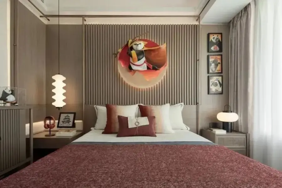 儿童房,以“红”为主调,以功夫熊猫为主题,融合多种文化元素,以中国风为主题,结合孩子们的角度,创造出一种既有中式风格又有卡通风的孩子空间。