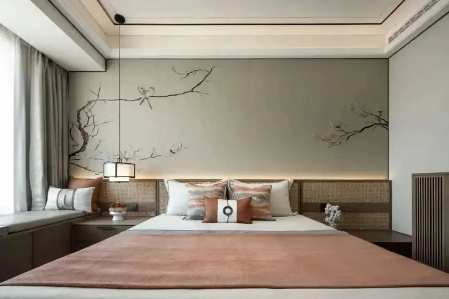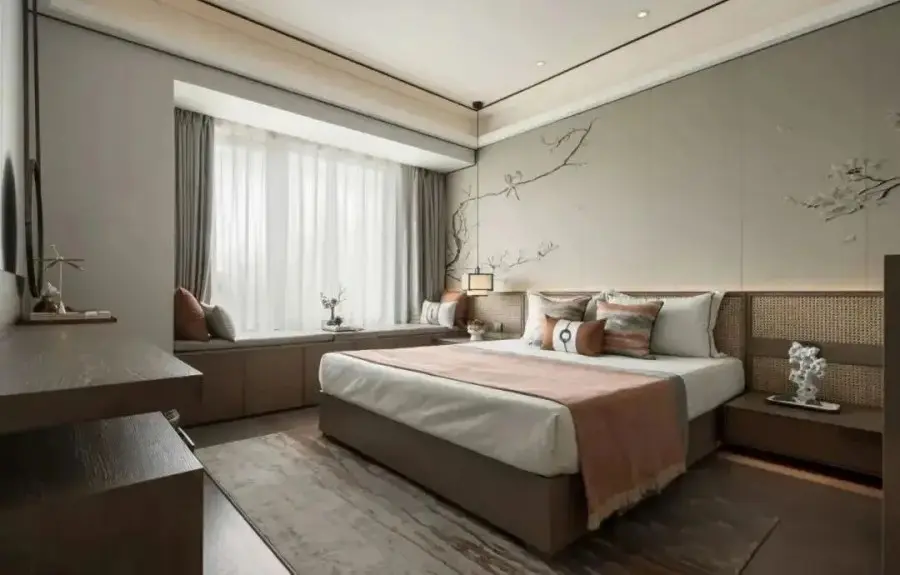 主卧,选用接近自然的木色,诠释了新中式的魅力,适合现代美学,在柔软的搭配上,加入了粉杏色做点缀,整体色调淡雅恬静,营造出一种宁静的氛围。