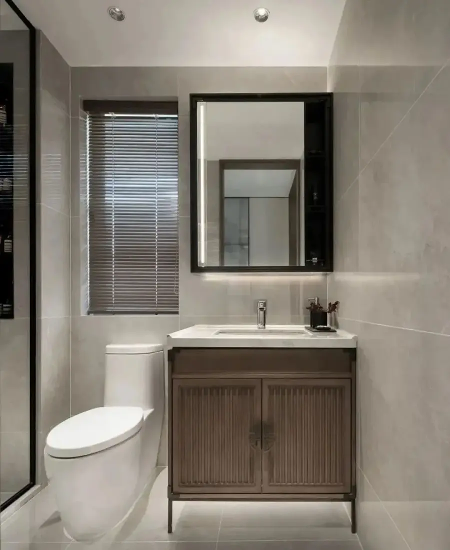 卫生间,用灰色的地砖来装饰整个空间,定制了一个中式的洗漱柜,传统的柜子结构和吉祥的半圆形把手,让现代的洗手间充满了东方的禅意。