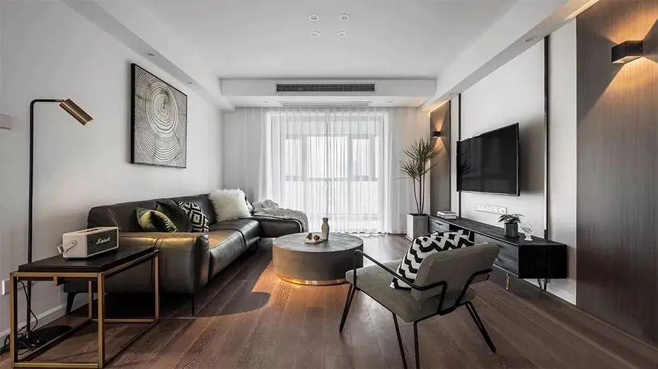 ▲ 实木地板加上深色系的软装风格。利用无主灯的设计,增加空间的层次感。