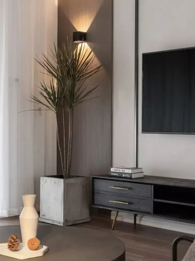 ▲ 黑色的电视柜和小边几遥相呼应,利用白色抱枕和绿植作为点缀,让空间更加清爽。