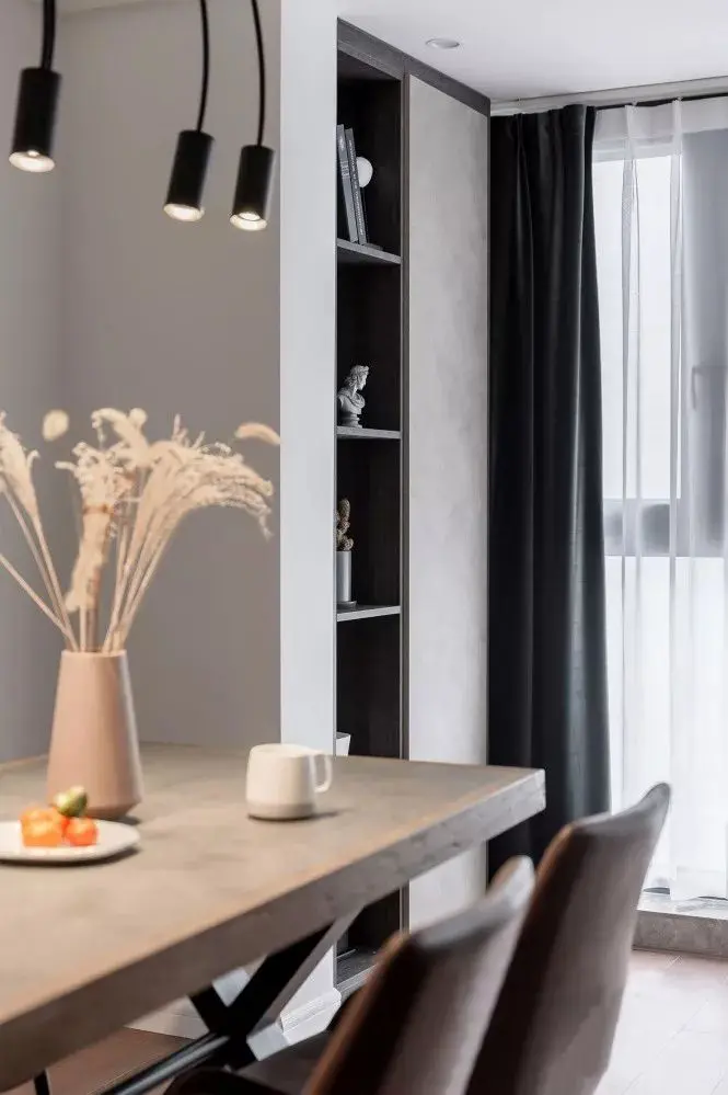 ▲ 餐厅另一边的展示柜,与客厅的茶几遥相呼应,都是仿水泥的质地,带有浓厚的工业风。展示和收纳为一体,方便实用。