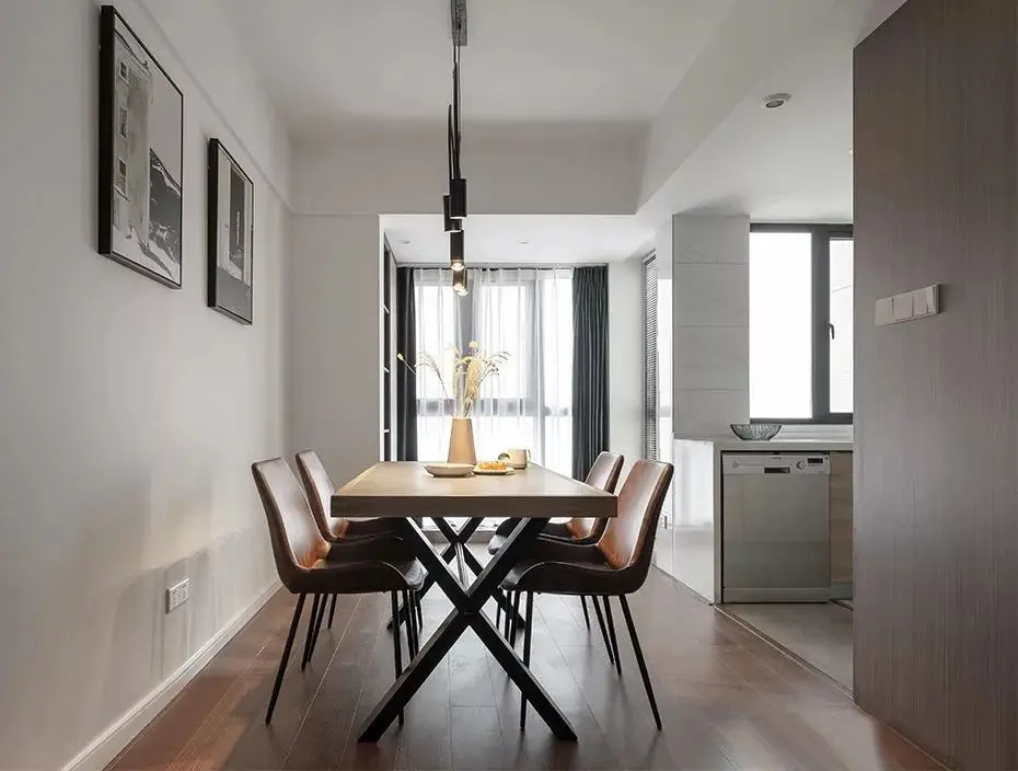 ▲ 原木色餐桌,棕色的皮质餐椅,暖橘色的筒灯洒下的灯光,让餐厅更加有情调。