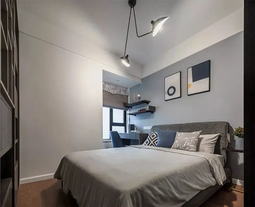▲ 灰蓝色墙面,用几何图案的挂画作为简单的装饰,更显活力。床头的一侧放置了一张书桌,方便小朋友学习。桌子上放的两个隔板,既可以放喜欢的书籍,也可以放置喜爱的装饰品,一举两得。