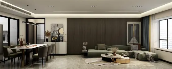 房屋整体风格为现代简约风,色调以奶白+咖色进行搭配,整体视觉凸显高级感,搭配无主灯设计提升屋内氛围感。