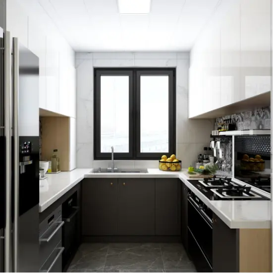 厨房采用大砖通铺,方便清洁,上白下灰的橱柜撞色搭配整体简洁明了。U型设计满足厨房操作动线,吊顶内设下拉式储物架,增加厨房储物空间的同时方便存取。顶部采用铝扣吊顶方便日常打理。