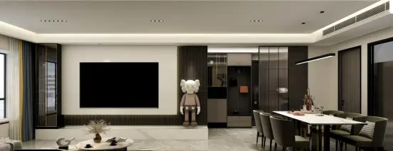 客厅电视墙为隐藏式收纳,即可保持与整体风格的协调性简洁性,同时增加储物空间。主卧门与沙发背景墙采用同材质制作隐形门,视觉整体协调的同时保证主卧区域的私密性。整体摒弃繁琐的装饰,运用色彩、材质搭配出空间格调。