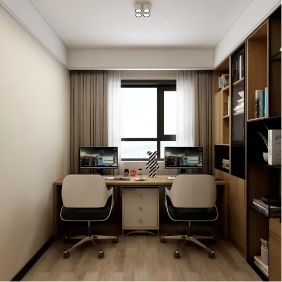 四室中相对较小的房间设置为书房,迎窗为写字台,为业主夫妇提供共同娱乐休闲区域。右侧为整墙通顶书柜,增加屋内储物空间。