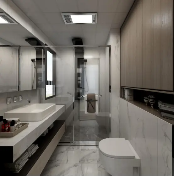 卫生间整体使用白色600*1200大砖上墙,进行干湿分离,壁挂式马桶节约空间且方便打理,上方墙面做简单内嵌收纳柜。