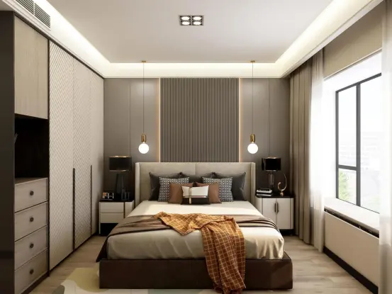 主卧色调延续了客厅中的咖色,搭配奶灰和雅白,营造出一个沉淀宁静的休息空间。