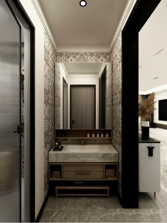次卫干区设置为可供可用的洗手台,迎合整体色调风格的同时也通过花式壁砖增加视觉效果。
