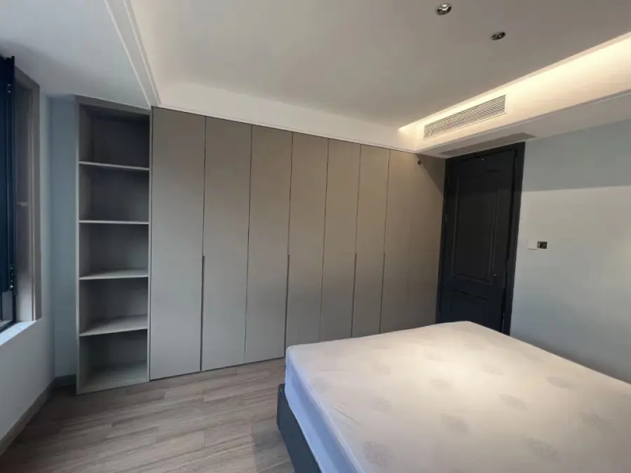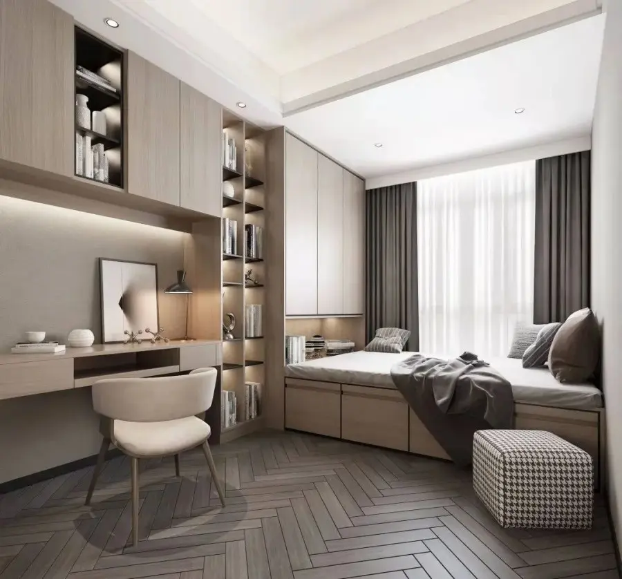 衣柜选择纹路细腻平板门,做一门到顶,顶封板内置,内嵌拉手,靠近床头的地方,外延出一部分,做床头柜,还有要保证见光板和门板同色。这样做出的衣柜更显高级感,整体一致性强,美感十足。