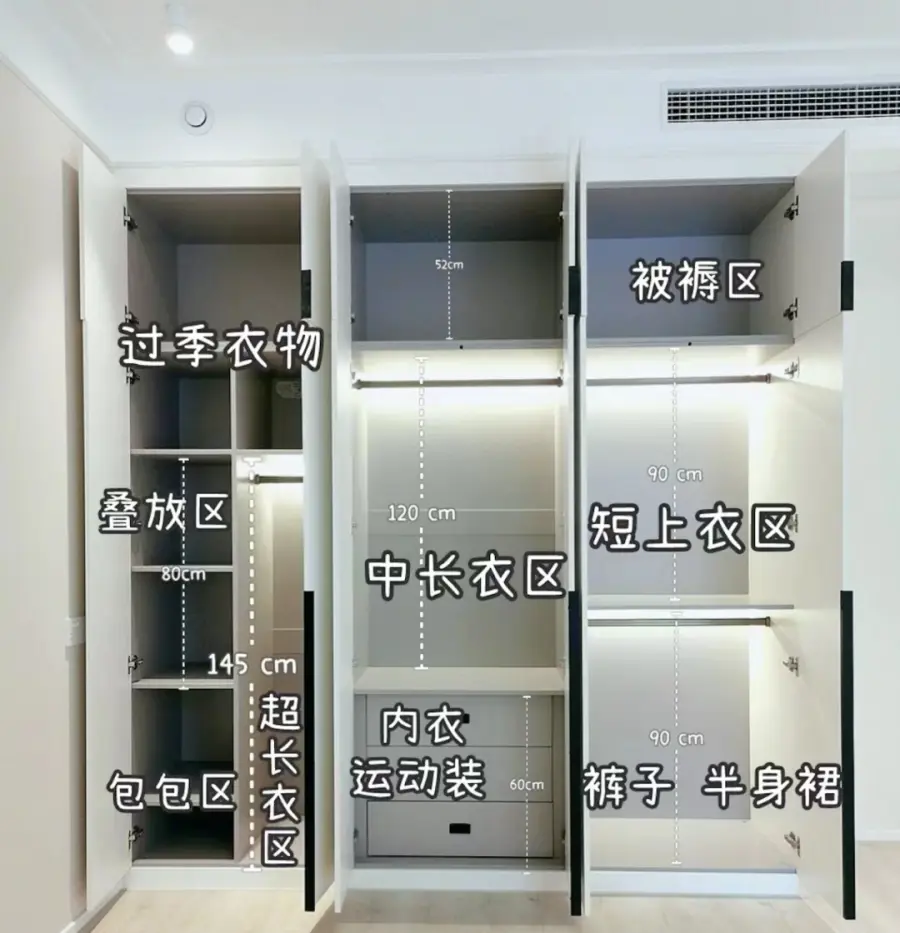 考虑到衣柜的收纳功能,在和设计师沟通需求的时候,可以对衣柜内部的布局推敲,结合居家的生活习惯,设计出最合理的布局。