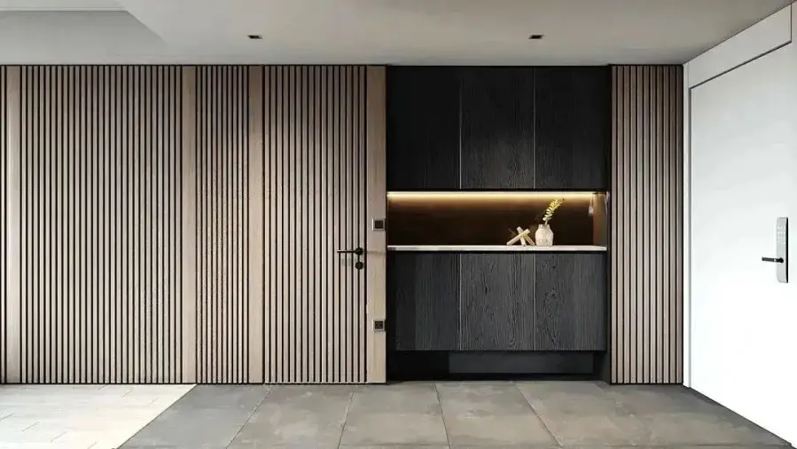 入户玄关墙面是一直延伸,选用原木色长城板装饰,鞋柜做入墙式设计,并且且选用水泥灰色来区分功能,鞋柜中间暗藏灯带,起到照明和调节氛围的作用。
