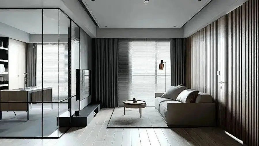 长城板装饰墙面从玄关一直延伸到客厅沙发墙,整体线条分明,木地板上铺灰色地毯,再放置灰色的布艺沙发,结合同色系的窗帘,共同组成自然惬意的客厅空间。