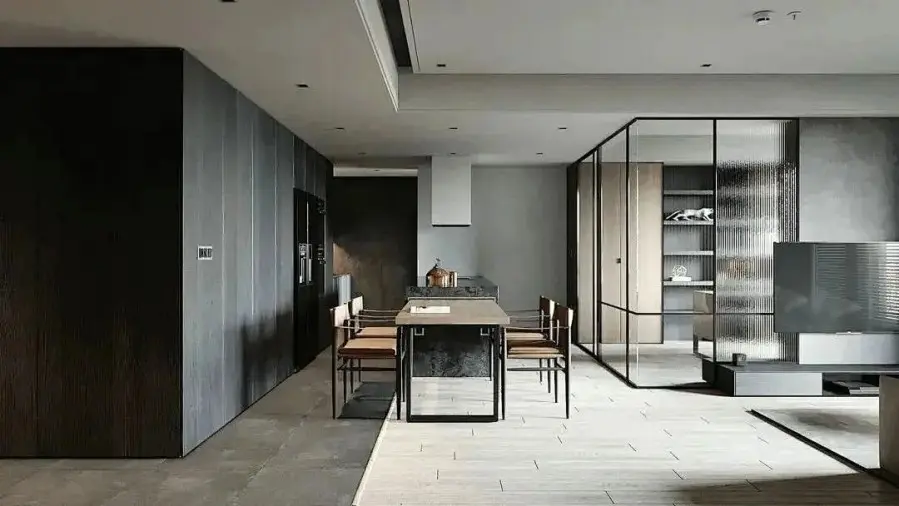 书房采用透明玻璃做隔断墙,所以餐厅和厨房采光并未受到影响,都显得格外明亮,视觉上也更显宽敞。且整个空间都是无主灯设计,显得客厅更加简洁大气。