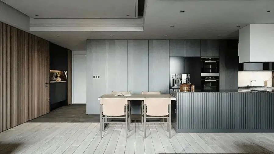 厨房这里餐桌紧挨着中岛台,中岛台主要作为西厨的操作台面,后方则是灰色调的收纳柜,做了嵌入式的整套烹饪器具。