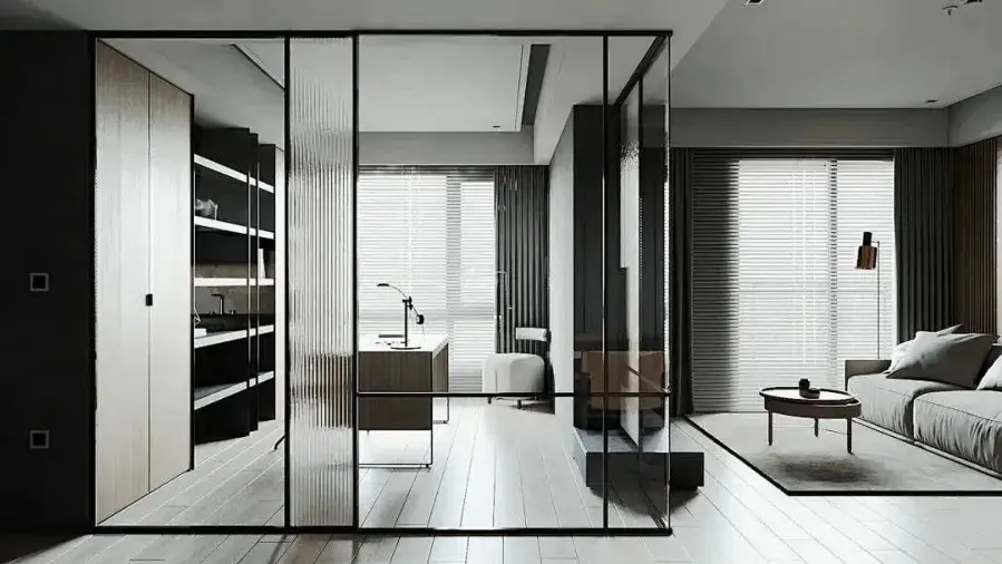 书房有两面墙都是采用玻璃做隔断墙,既进行了空间的功能划分,又不影响厨房餐厅的采光,而且在客餐厅也能对书房空间一目了然。