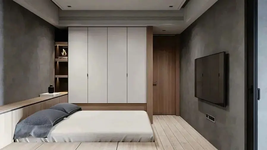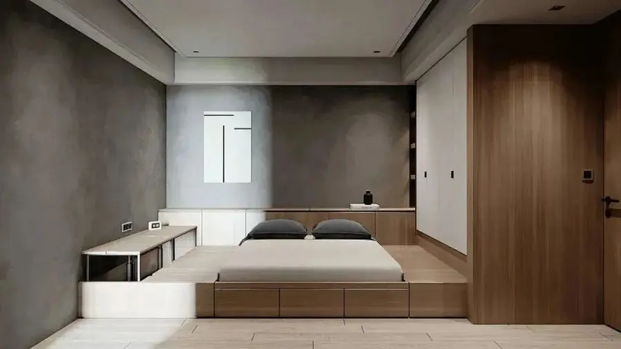 卧室最主要的色调由水泥灰色+原木色打造,两种颜色的组合使得这个空间更显优雅,直接定制地台床的设计,还能结合抽屉柜、衣柜一起,令卧室实现更多功能。