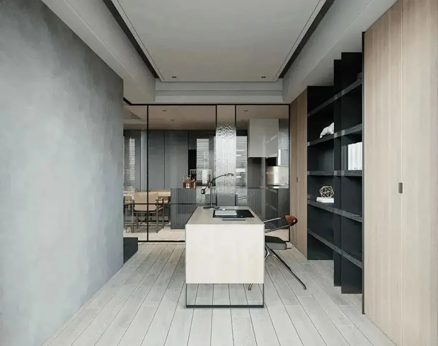 整个书房唯一的墙面用水泥灰色涂刷,其他墙面则是柜体和玻璃隔墙,所有的色彩最终营造出极简的空间氛围。