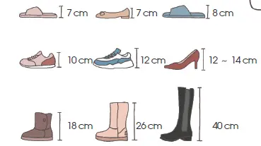 鞋柜底板之间的距离一般在16 cm左右,这个尺寸并不适用于所有的鞋,因为不同款式的鞋高度差别很大,如下图。