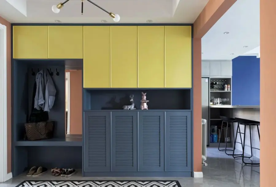 该鞋柜进深40 cm,换鞋凳高度41 cm,色彩搭配大胆,巧妙地制造视觉冲突,底部的百叶窗柜门板有利于通风,散热,散热。