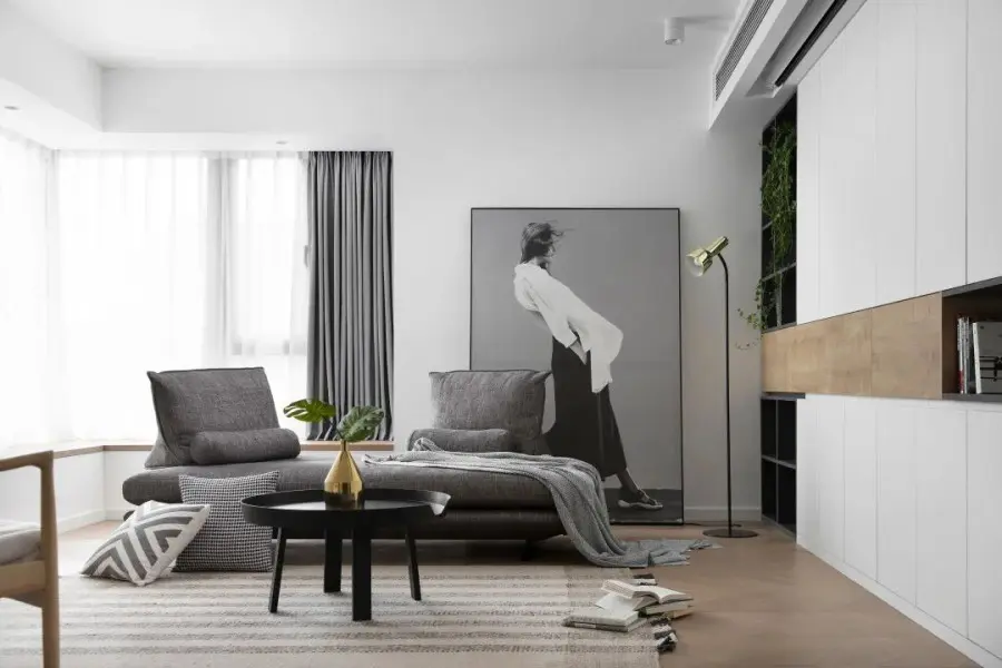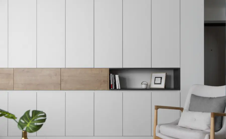 设计者放弃了电视墙,在客厅定制了整个线条整齐的高档储物柜,将公共区域的闲置物品完全隐藏在无形中。藏八露二的储物结构美观实用。