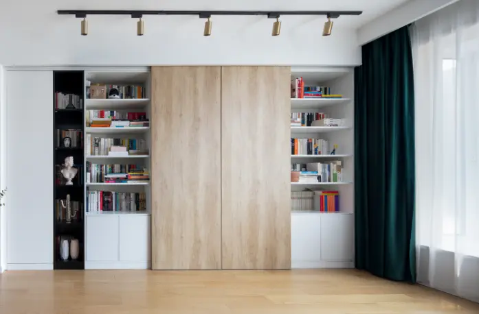 为避免孩子们在家里总看电视,设计师在电视机后面安装了两个推拉门。机柜进深50 cm,可收纳大部分公共物品,吊顶预留6 cm宽的沟槽,用于安装大芯板,用于固定推拉门轨道。