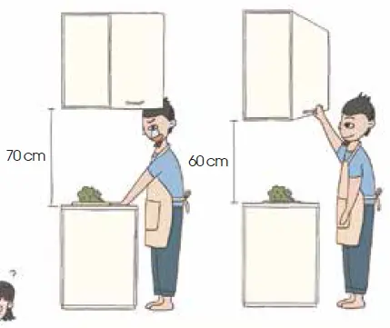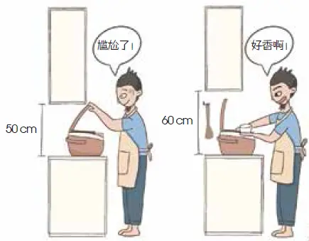 如柜体到台面距离大于60 cm,如70 cm,开关柜门时容易碰到。