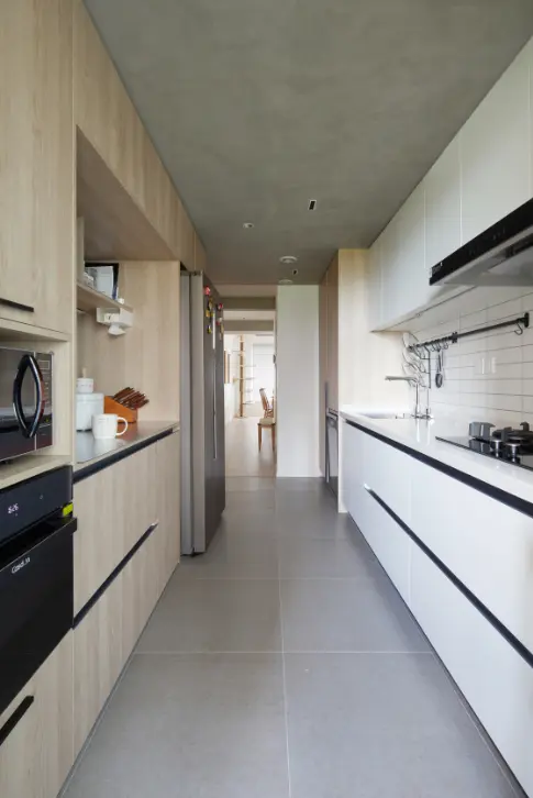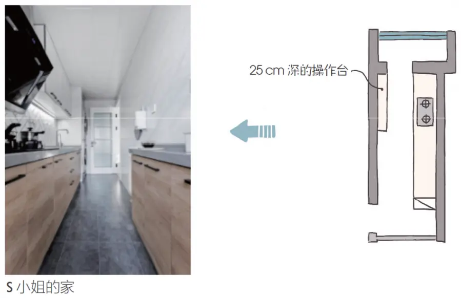 例如图中的 S家,她们家特地定做了25 cm深的薄橱柜,既能保证厨房舒适的走道宽度,又能增加储物空间,两全其美。