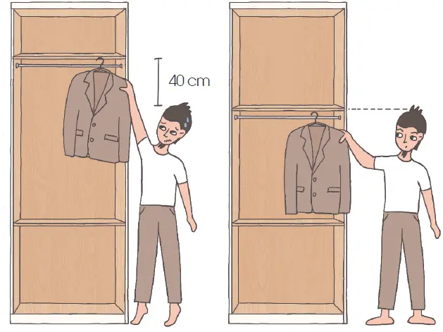 若第一层板面过低,衣柜会分割得更细,更不实用;而大于20 cm,我们每天穿着换装时需要频繁踮脚、仰头、伸展手臂,太麻烦了!(以下图片,请自行感受)