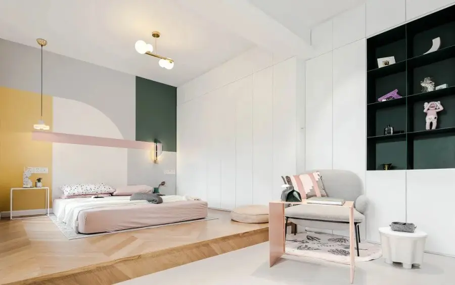 地面上升到休憩区域,将公共与私密区域分开,地面高低差也让空间更有层次感。省掉了床和床头柜,直接用床垫代替,一排上衣柜(入深50 cm)非常收纳。